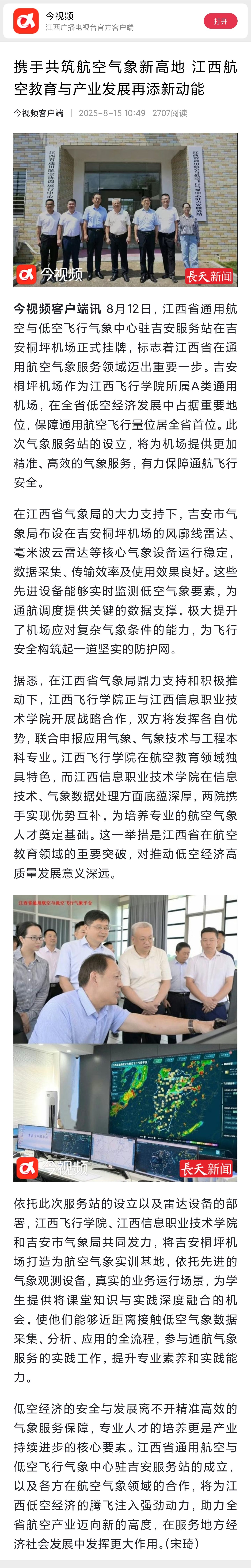 近日,今视频报道,携手共筑航空气象新高地 江西航空教育与产业发展再添新动能详情如下: