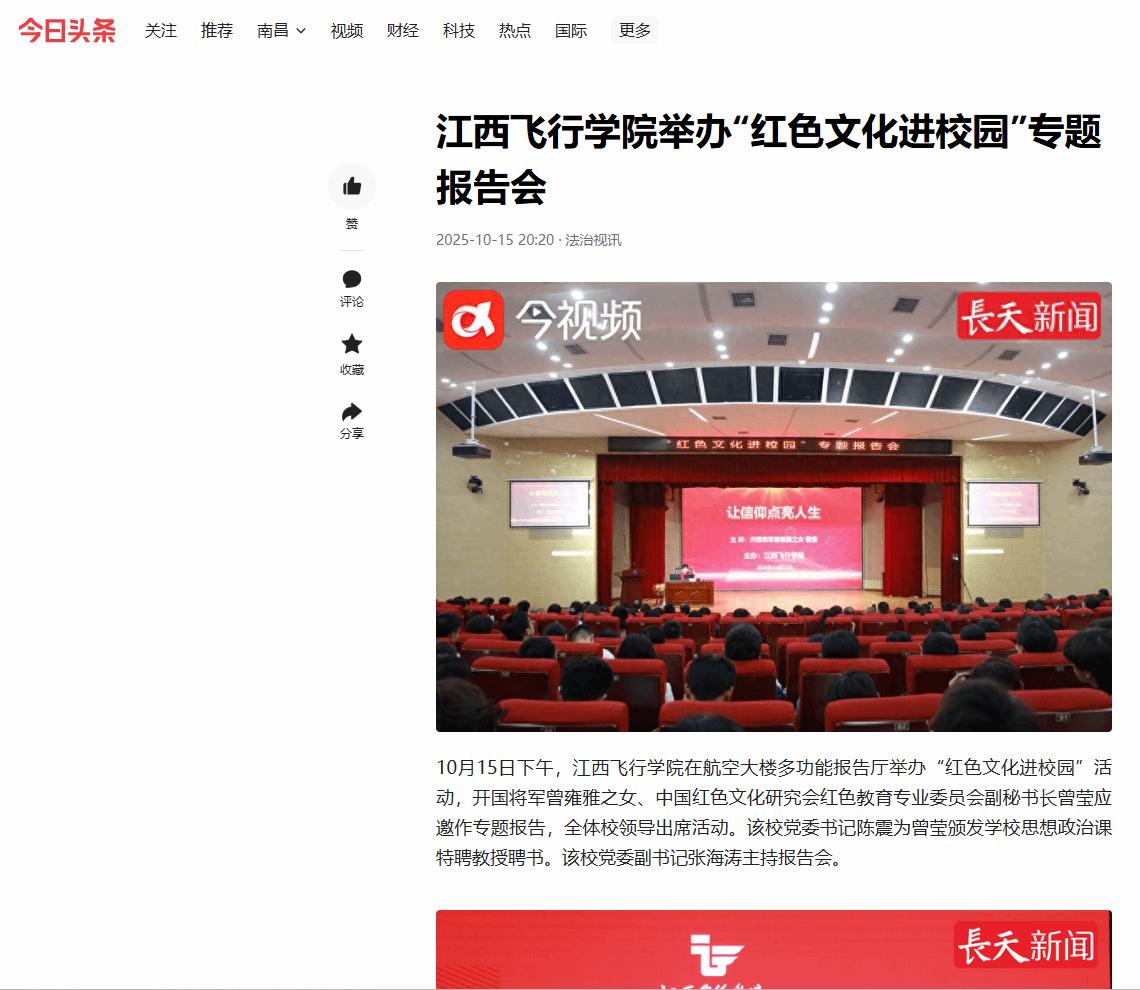 近日,今日头条报道,江西飞行学院举办“红色文化进校园”专题报告会详情如下: