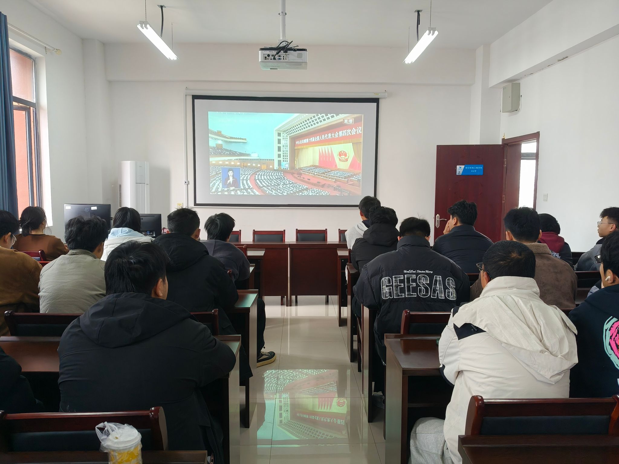 3月5日上午9时,十四届全国人大四次会议在北京人民大会堂隆重开幕。学院组织无课师生代表在学院会议室、党员活动室集中收看开幕会直播,认真聆听政府工作报告。